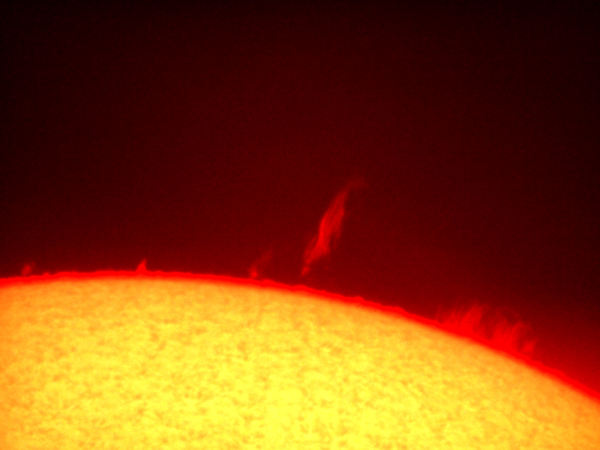 Auf diesem Bild sind folgende Erscheinungen auf der Sonne zu sehen: Protuberanzen Es ist eine stabförmige Protuberanz vom Typ 1SB mit einer Höhe von 90 000 km zu sehen. Die Vorhangartigen Protuberanzen sind vom Typ 2FB (Klassifikation nach P.Völkel) und haben auf einer Basis von 15 000 km eine Höhe von 29 000 km. Spikulen Der unregelmäßige Rand der Chromosphäre wird durch die Spikulen verursacht. Die Höhe der Spikulen beträgt etwa 1000 bis 3000 km. Chromosphärisches Netzwerk Eine Erscheinung der nicht aktiven Sonne. Hier auf dem Bild ist es als dunkle Strukturen auf der Sonne zu sehen und besitzen eine Größe von 5 000 bis 10 000 km. Die Auflösung ist durch Luftunruhe auf 2“ entsprechend 1500 km begrenzt. |