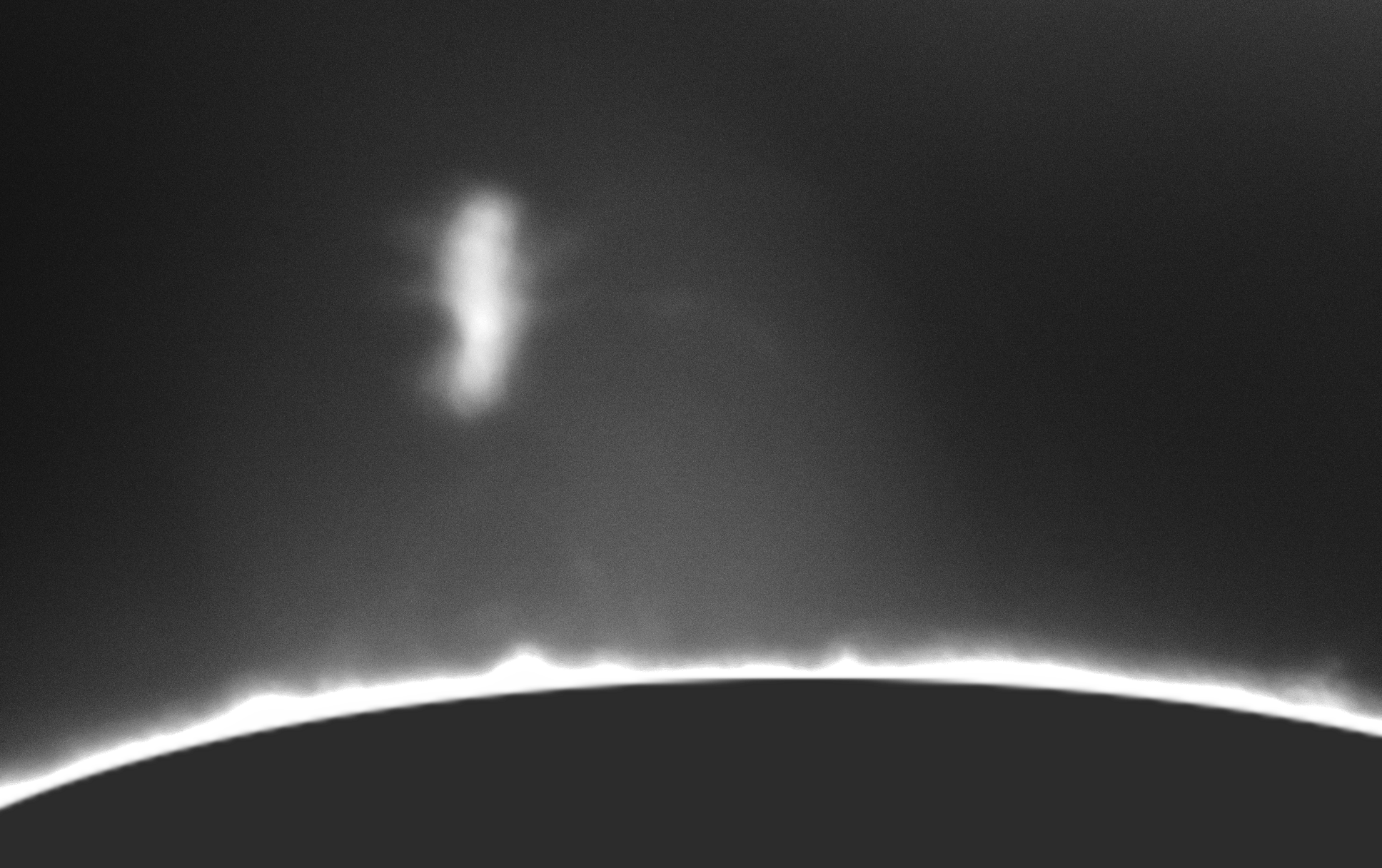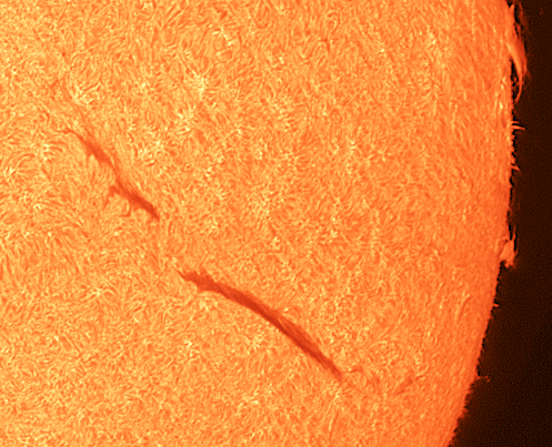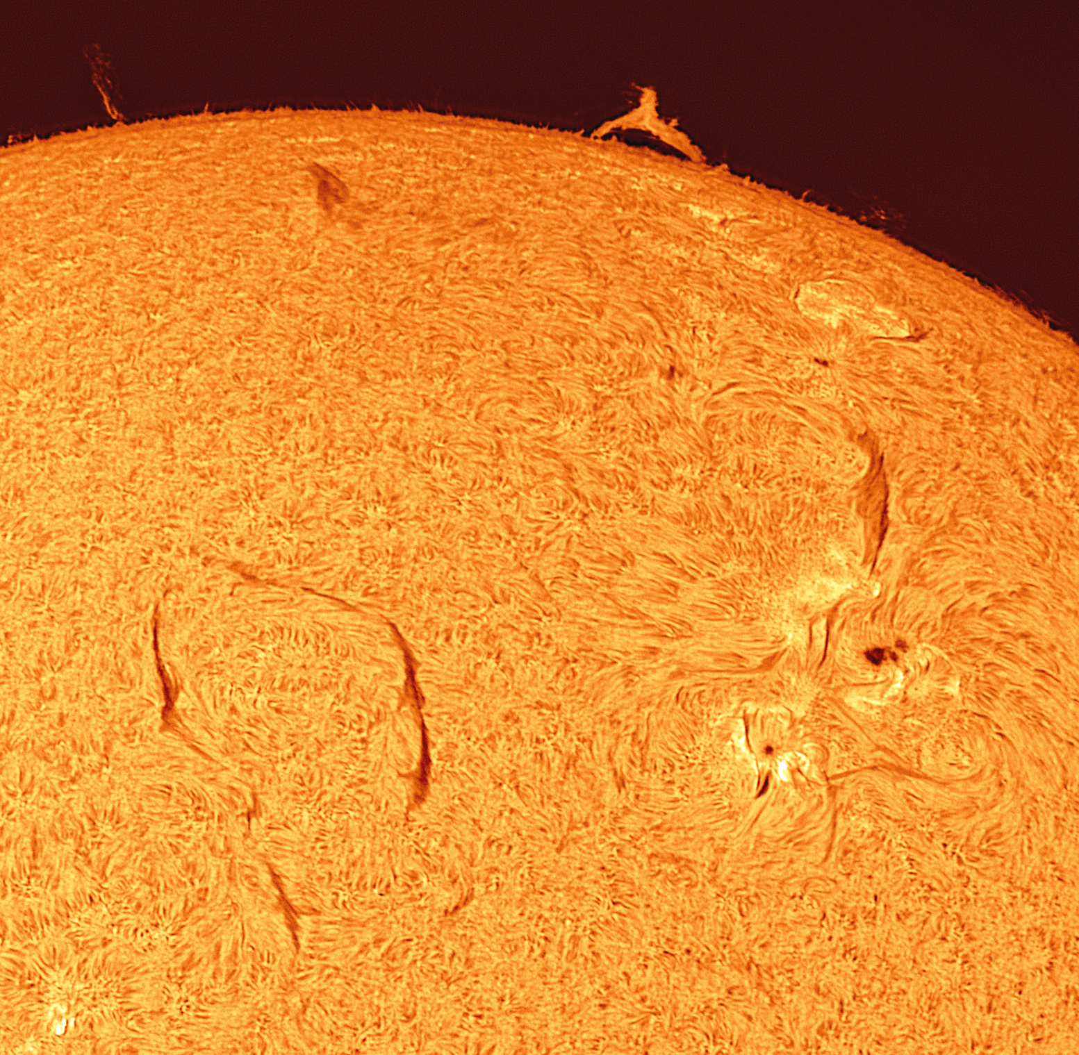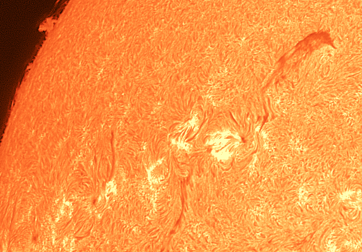 Über der Chromosphäre steigen Protuberanzen auf. Links im Bild ist auch ganz schwach eine schwebende Protuberanz zu erkennen.