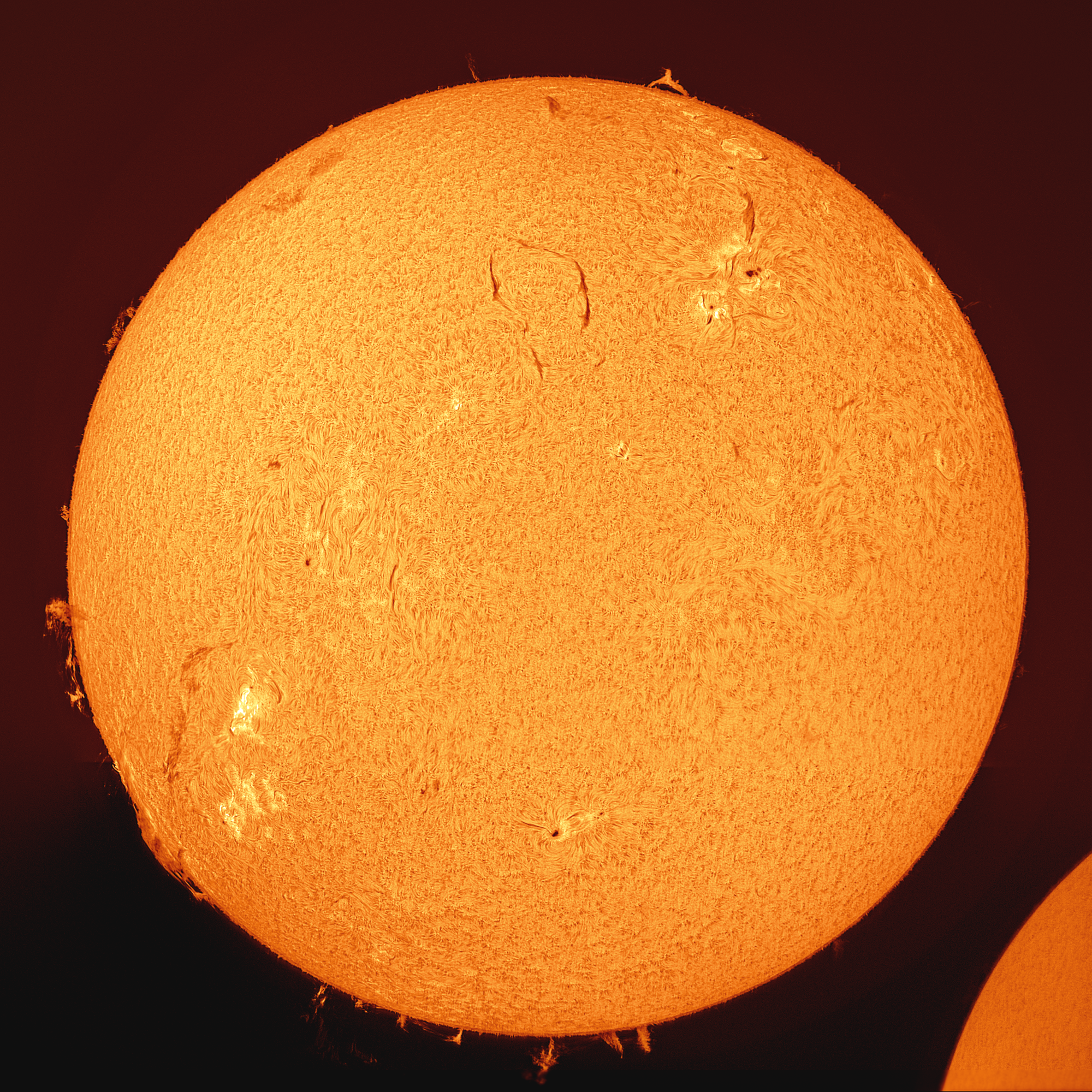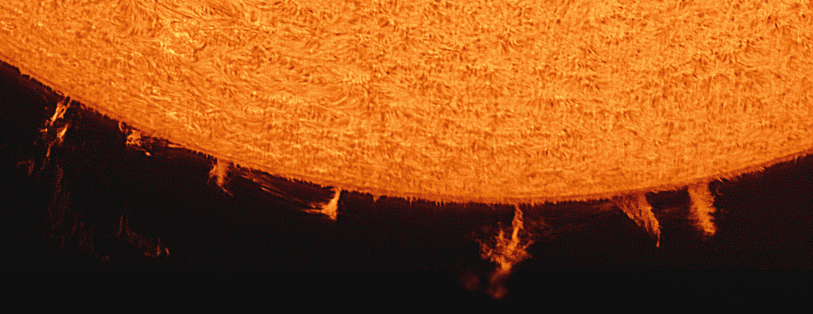 Unter den Protuberanzen leuchtet als ganz dünne Haut die Chromosphäre. Deutlich zu erkennen sind auch die Spikulen als feine Härchen.