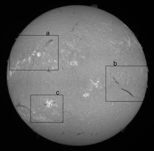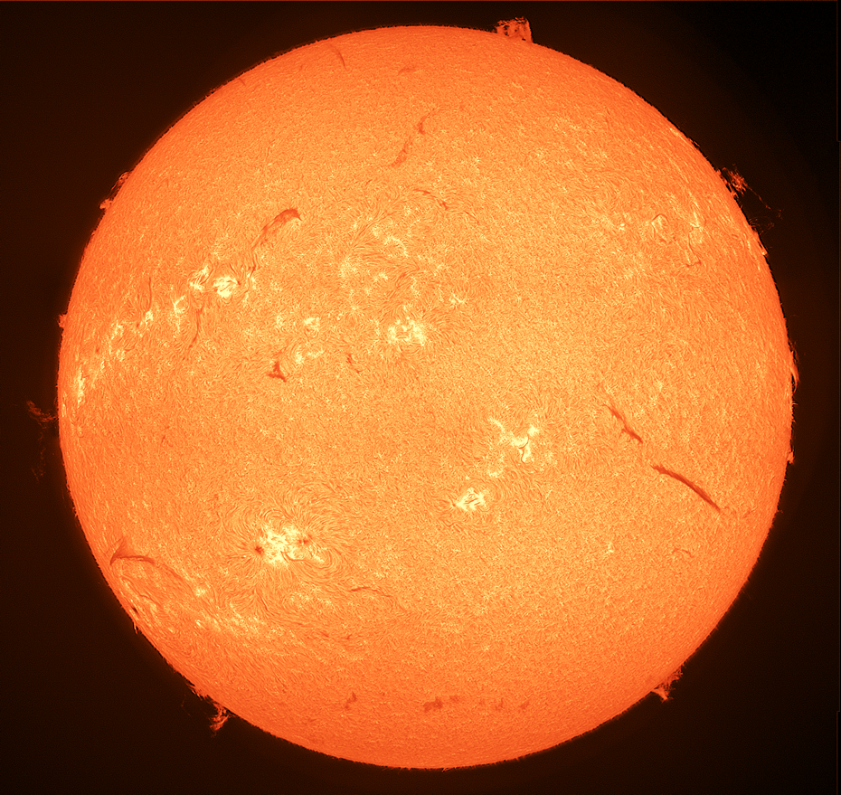 Auf der Sonne sind 12 Fleckengruppen zu beobachten. Es sind hier auf der H-alpha Aufnahme Flares, und Filament zu sehen.