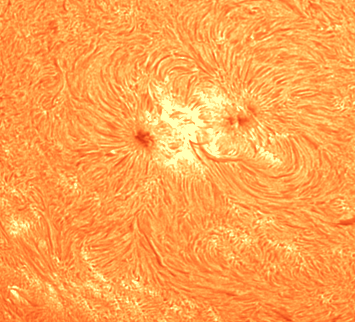 Die Sonnenflecken sind von hellen Flaregebieten umgeben. Es sind viele Filamente zu sehen.
