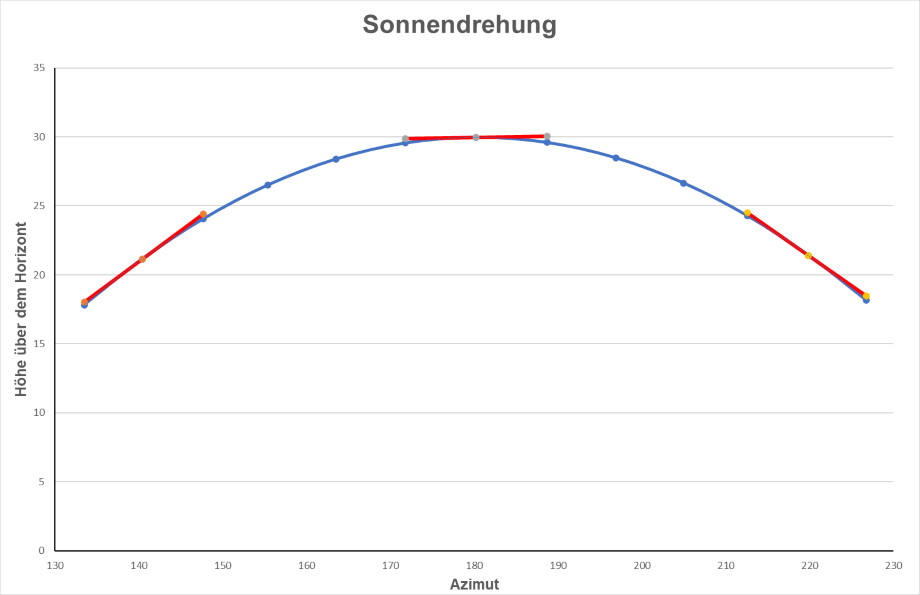 In der Graphik ist der Lauf der Sonne am Himmel am 25. Oktober dargestellt. Mittags um 12 Uhr erreicht sie ihren höchsten Stand in 30 Grad über dem Horizont. Sie steht jetzt "gerade"am Himmel, das heisst der Äquator steht horizontal. Davor und danach, entsprechend ihrer Bahn, schräg. Die roten Geraden in der Graphik geben die Lage des Äquators der Sonne wieder. |