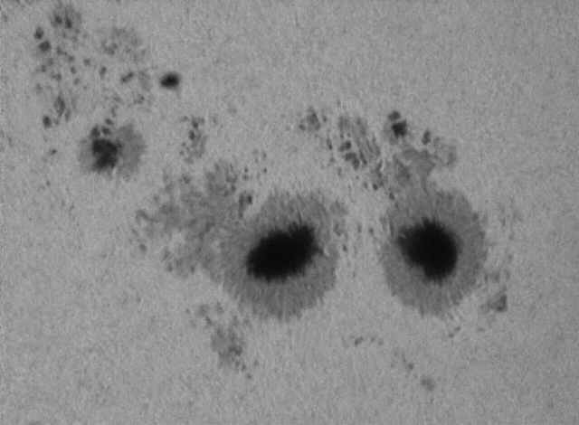 Umbra, die schwarzen Gebiete im Sonnenfleck, diese schwarzen Gebiete hier sind so groß wie die Erde. Gut zu erkennen ist der bipolare Aufbau einer Fleckengrupp, ein Fleck ist der Nordpol - einer der Südpol. Die Temperatur ist hier 2000 Grad kühler als die Sonnenoberfläche, also etwa 3500°C (deswegen erscheinen diese Gebiete so dunkel) |