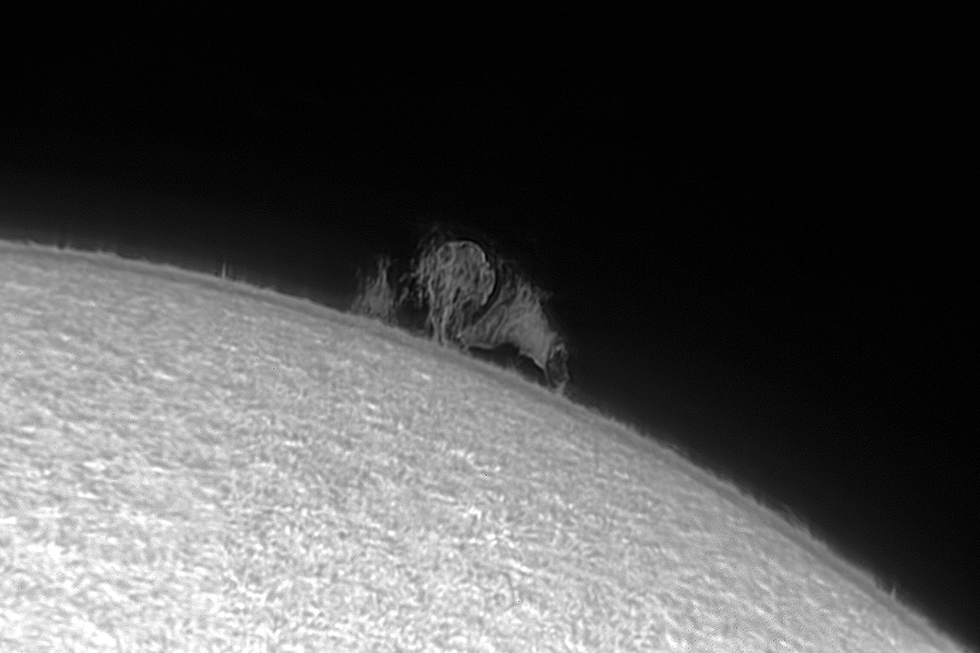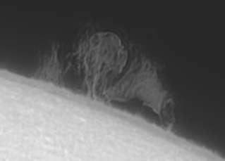 Weiter am Rand der Sonne ist ein dunkles, bogenförmiges Band zu sehen. dieses Band besteht aus Sonnenplasma, das sich entlang von Magnetfeldlinien bewegt. |