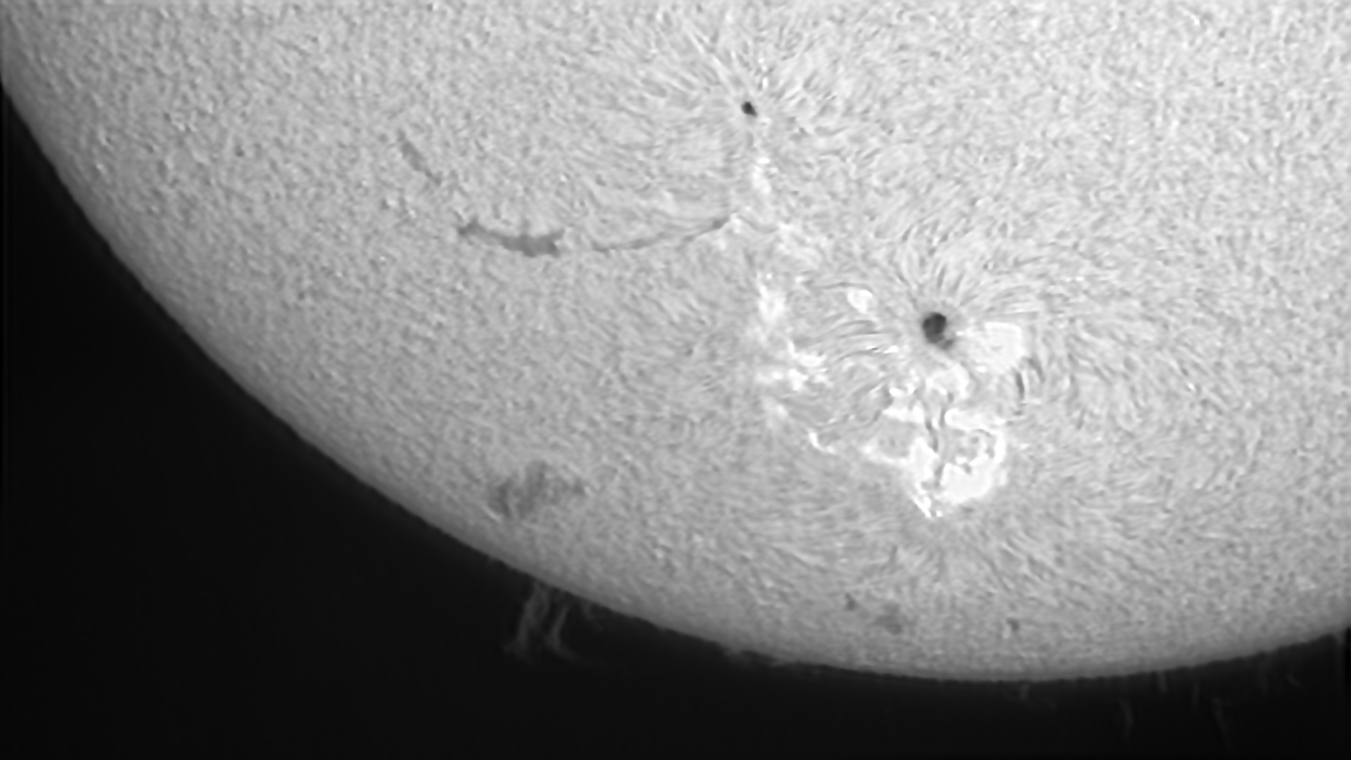 In der Mitte des Bildes oben fällt zu erst das helle Gebiet auf. Die Flares oder Fackeln zeigen ein Aktivitätsgebiet auf der Sonne. Hier treten Magnetfelder aus der Photosphäre der Sonne aus und erhitzen sie. So sind diese Gebiete heller als die Umgebung.