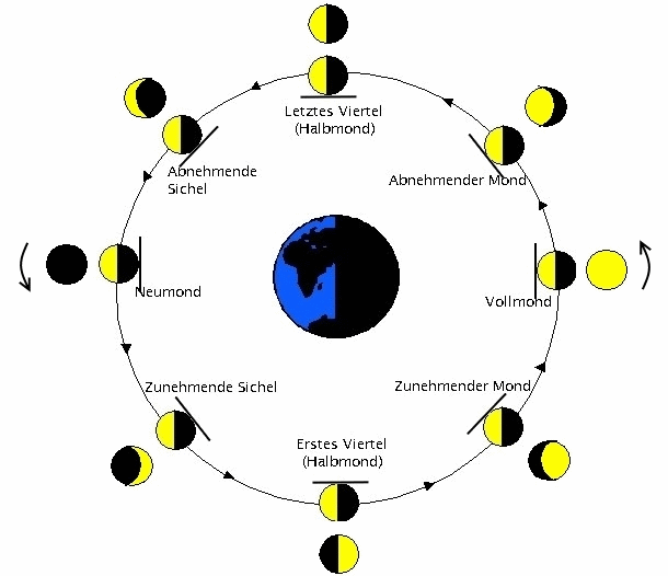 In der Darstellung oben ist zu erkennen, dass von Neumond bis Vollmond der Mond eine halbe Umdrehung macht. Auf dem inneren Kreis ist der Mond dargestellt, wie er von außerhalb der Erde zu sehen ist. Der Strich stellt die Seite dar, die uns der Mond ständig zuwendet. Im äußeren Kreis ist der Mond mit seinen Phasen gezeichnet, so wie er von der Erde aus zu sehen ist. |