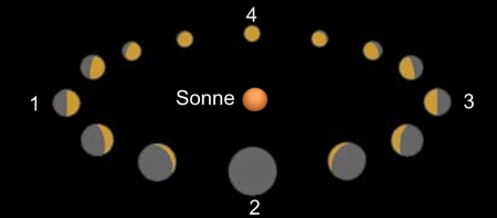 Im Bild rechts ist die Phase bei 2 kurz vor der unteren Konjunktion zu beobachten. |