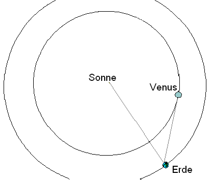 Die Venus ist, genauso wie Merkur, ein innerer Planet. Sie zieht ihre Bahn um die Sonne innerhalb der Erdbahn. Die Venus ist der Sonne also näher als die Erde.