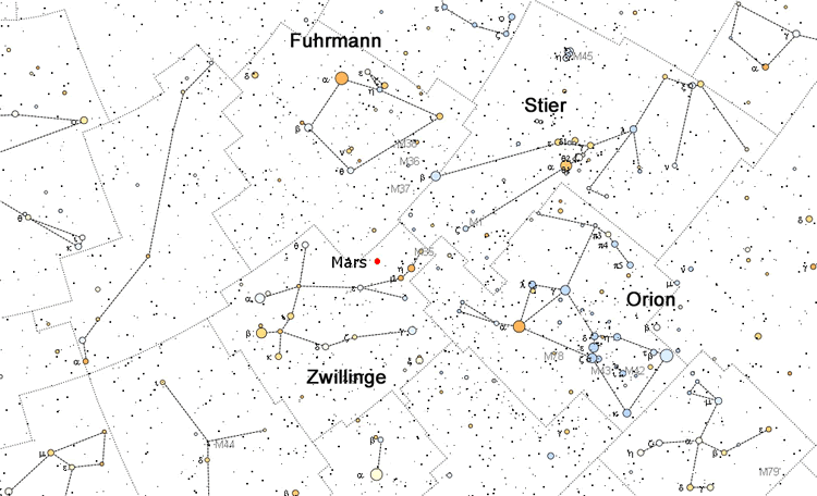 Mars steht am 24.12. in Opposition zur Sonne, er ist deshalb die ganze Nacht im Sternbild Zwillinge zu sehen. Diese Karte soll das Auffinden erleichtern. Mars ist der hellste „Stern“ in der Umgebung und leuchtet rötlich. |