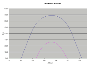 Befindet sich ein Planet im Winter in Opposition, so sind die Beobachtungsbedingungen besonders günstig, denn im Winter steht die Ekliptik (Kreis, auf dem sich die Körper des Planetensystems bewegen) nachts hoch über dem Horizont, am Tag niedrig. | ![]() |