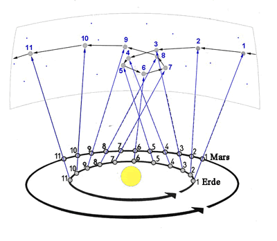 Sie kommen dadurch zustande, dass die schnellere Erde den Planet während der Opposition innen überholt. Dadurch erscheint der Planet sich relativ zu den Sternen zeitweise rückwärts zu bewegen. Er scheint erst stehen zu bleiben (stationär 5 ) bewegt sich dann entgegen seiner normalen Richtung vor dem Fixsternhimmel (rückläufig 5), um dann wieder stationär zu werden und wieder seine Bahn in gewohnter Richtung (rechtläufig 6) fortzusetzen. | ||||||||||||||||