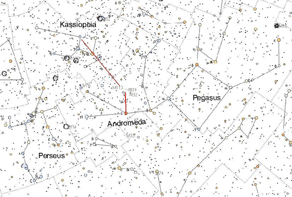 Auffind-Hilfe Die Sternkette der Andromeda hängt am Vierecks des Pegasus Der Andromedanebel lässt sich mit Hilfe des „W“ der Kassiopeia auffinden und der drei Sterne, die über der Andromedalinie zur Galaxie führen. |