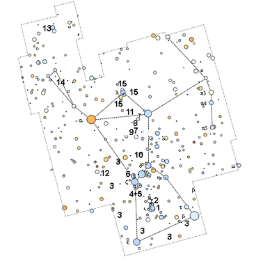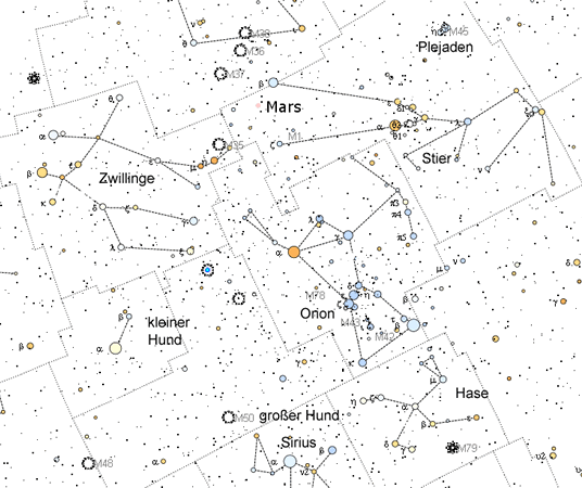 Der Orionnebel hat eine Helligkeit von 2.4magnitude und ist mit bloßem Auge unterhalb der Gürtelsterne des Orions zu sehen. In der Auffindkarte ist er mit der Messier- Nummer M 42 vermerkt. |