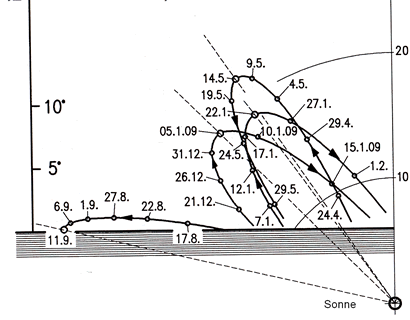 In dem Bild sind die vier Abendsichrbarkeiten von Merkur bis Januar 2009 dargestellt. Die Merkurbahn ist dabei jedes mal unterschiedlich über dem Horizont geneigt, deswegen sind die Höhen über dem Horizont (links im Bild aufgetragen) so unterschiedlich. Rechts ist der Winkelabstand zwischen Merkur und Sonne (östliche Elongation) dargestellt. |