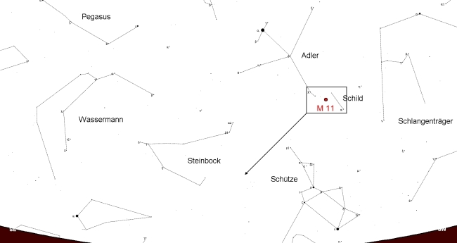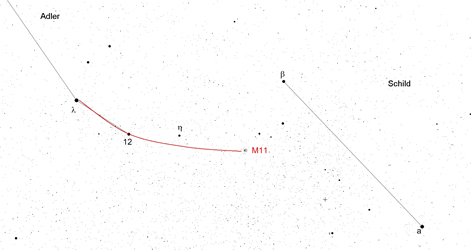 Eine Aufsuchhilfe ist gegeben, indem man die Sterne lambda und 12 Aquilae (Adler) mit einer Bogenlinie verlängert, auf der dann M 11 liegt. |