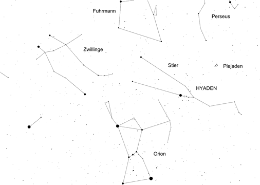 Die Hyaden sind ein offener Sternhaufen im Sternbild Stier. Er bildet das markante V am Kopf des Stieres. Seine Mitglieder scheinen verstreut über eine Fläche von 8 Grad im Durchmesser um den Stern Aldebaran zu liegen (der selbst nicht zum Haufen gehört, sondern im Vordergrund steht). |
