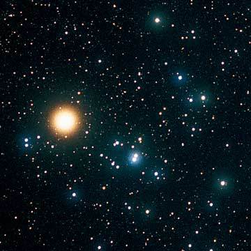 Die Hyaden sind mit einer Entfernung von etwa 150 Lichtjahren der nächste Sternhaufen. Aufgrund seines hohen Alters von 625 Millionen Jahren findet sich in ihm kein Gas und Staub mehr, seine Mitglieder haben sich bis zu 13 Lichtjahre voneinander entfernt. |