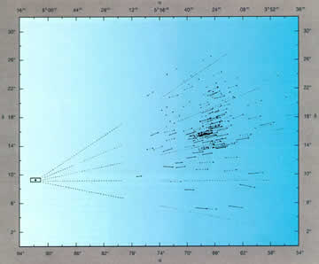| Das Bild links zeigt die Bewegung der Sterne der Hyaden. Mit diesen Messungen kann die Entfernung bestimmt werden. Die Sternstromparalaxe ist ein wichtiges Verfahren in der Entfernungsbestimmung. | ||||||||||||