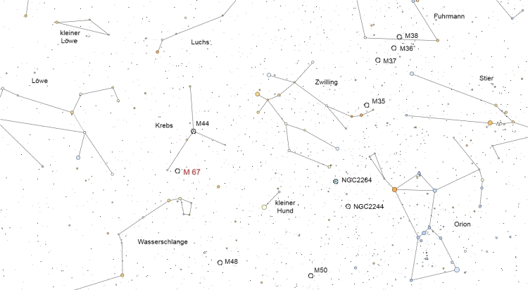 M67 gehört zu einer Ansammlung von Sternhaufen (siehe Tabelle), die sich alle östlich des Orion Spiralarm befinden, mit dem ein enger Zusammenhang besteht. Der Orionarm, oder auch als lokaler Arm bezeichnet, ist ein etwa 2000 Lichtjahre breiter Spiralarm der Milchstraße, an dessen zum galaktischen Zentrum hin gelegenen Rand sich unsere Sonne befindet. Der Orionarm, dessen Länge in etwa 20.000 Lichtjahre beträgt, liegt zwischen den Spiralarmen Sagittarius und Perseus und ist vermutlich wegen seiner kleine Länge ein Nebenarm. Er ist etwa 26.000 Lichtjahre vom Zentrum entfernt und zeichnet sich durch ein Sternentstehungsgebiet aus, zu dem neben dem Orion-Nebel auch eine Reihe junger, heißer Sterne der Klassen O und B gehören. Diese Objekte gehören zum Sternbild Orion. Aus diesem Grund erhielt der Orionarm seinen Namen. (Galaxien ) |