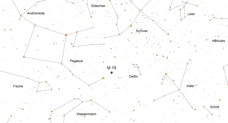 Messier 15 (auch als NGC 7078 bezeichnet) ist ein 6,2 mag heller Kugelsternhaufen mit einer Winkelausdehnung von 18′ im Sternbild Pegasus. Seine Entfernung beträgt etwa 30.000 Lichtjahre. Die hellsten seiner mindestens 500.000 Mitglieder erreichen eine scheinbare Helligkeit von 12,6 mag. Der Sternhaufen wurde 1746 von Jean-Dominique Maraldi entdeckt und als nebelhafter Stern beschrieben. |