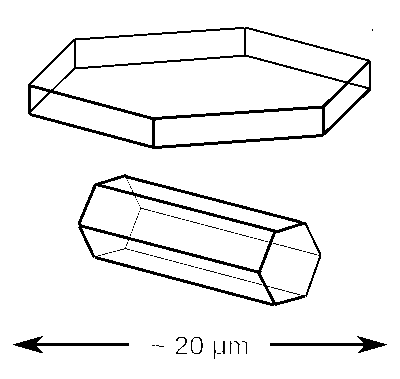 Wasser kristallisiert als Dünne sechseckige Plättchen und kleine sechseckige Säulen. Diese Kristallformen sind die, die dabei am häufigsten vorkommen und hauptsächlich für die Bildung von Halos verantwortlich sind. Werden die Kristalle jedoch langsam größer, weisen sie eine entsprechend größere Sinkgeschwindigkeit auf und nehmen eine stabile Lage ein, die eine bevorzugte Orientierung aufweist, verursacht durch symmetrische Wirbel an der der Fallrichtung abgewandten Seite. |