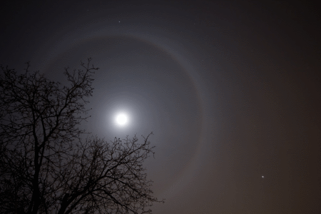 Auch um den Mond lassen sich Haloeffekte beobachten. Allerdings ist das menschliche Auge bei geringer Lichtintensität kaum in der Lage, Farben wahrzunehmen, weshalb die schwächeren Mond-Halos weiß erscheinen. Halos lassen sich unter obigen Bedingungen um nahezu jede stärkere Lichtquelle beobachten. |
