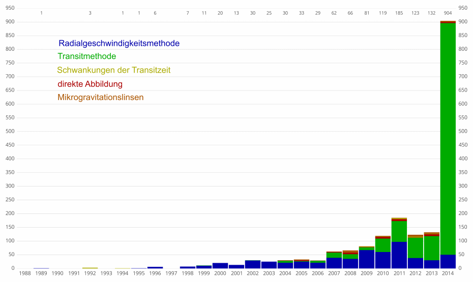 Bild wikimedia commons, es zeigt wieviele Exoplaneten mit welcher Methode wann gefunden wurden. |