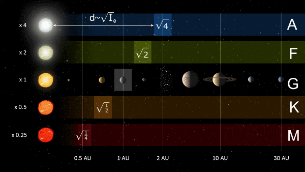 Vereinfacht lässt sich sagen: Bei einem Stern mit 25 % Sonnenhelligkeit würde der Zentralbereich der habitablen Zone etwa 0,5 AE vom Stern entfernt sein, bei einem Stern doppelt so hell wie die Sonne wäre der Abstand 1,4 AE. Das ist das Ergebnis des Abstandsgesetzes der Lichthelligkeit. Der Zentralbereich der bewohnbaren Zone ist in diesem einfachen Modell so definiert, dass ein Exoplanet mit vergleichbarer Atmosphäre der Erde (Aufbau und Dichte) in etwa der globalen Durchschnittstemperatur der Erde entspricht, die Ränder entsprechen den Temperaturen, bei denen Wasser gefriert beziehungsweise siedet. |