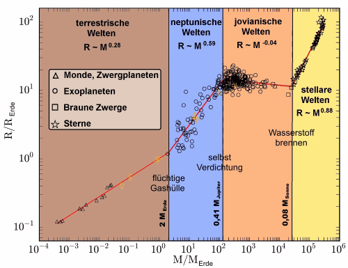 - Oberhalb von 2 Erdmassen beginnt die „Neptunische“ Region, bis hoch zu etwa 0.41 Jupitermassen (oder etwa 130 Erdmassen). Demnach gäbe es im Sonnensystem drei „Neptunier“: Uranus, Neptun und Saturn, der sich in der Übergangszone zu den „Jovianischen“ Planeten befindet. Im Bereich der „Neptunier“ beträgt der Exponent 0.59 statt 0.28,