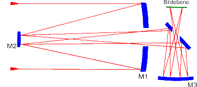 Korsch-Teleskop: M1: ellipsoider Parabolspiegel – M2: hyperbolischer Sekundärspiegel – M3: ellipsoider Tertiärspiegel Wesentliche Vorteile sind ein ebenes Bildfeld und weniger Streulicht in der Abbildungsebene. |
