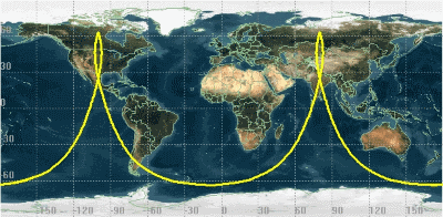 Verläuft ein Orbit nicht exakt über dem Äquator bildet er im einfachsten Fall einen Kreis, dessen Mittelpunkt mit dem Erdmittelpunkt zusammenfällt. Diese Bahnebene steht in erster Näherung fest im Raum, während sich die Erde mit ihrer täglichen Rotation darunter wegdreht. Auf diese Weise verläuft die „Bodenspur“ des Satelliten in einer charakteristischen Wellenbahn um die Erde, die sich von Umlauf zu Umlauf verschiebt. Bei oberflächennahen Umlaufbahnen (auch LEO, s. u.) beträgt die Umlaufzeit ca. 100 Minuten, so dass sich die Bahn von Umlauf zu Umlauf um rund 25° in westlicher Richtung verschiebt. Das entstehende Wellenmuster mit den parallelverschobenen Umlauf-Bodenspuren ist in der Abbildung unten zu erkennen. Bei einer Kreisbahn ist dieses Muster immer symmetrisch zur Äquatorlinie. (Beispiel: Uhuru) |