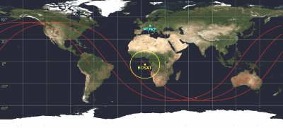 Das Bild zeigt die Bodenspur des niedrig fliegenden Satelliten ROSAT, der im Oktober 2011 abstürzte. Während einer 5-stündigen Beobachtung legte der Satellit die als rote Bodenspur markierte Strecke zurück. Die Aufschlagszone für die verschiedenen Trümmerteile bildet immer eine langgestreckte Ellipse in Bahnrichtung. (in dem Gebiet des gelben Kreises). |