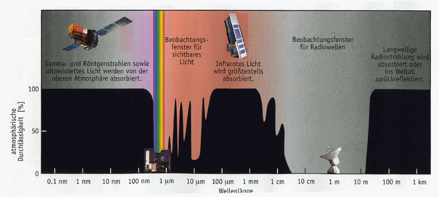Bei den astronomischen Satelliten können auch die Wellenlängen des elektromagnetischen Spektrums beobachtet werden, die die Erdatmosphäre nicht passieren können.