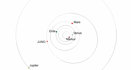 Der Asterioid (3) Juno umkreist die Sonne im Asteroidengürtel in einem Abstand von 1,989 bis 3,351 AE. Dabei beträgt die siderische Umlaufzeit 4 Jahre und 133 Tage.