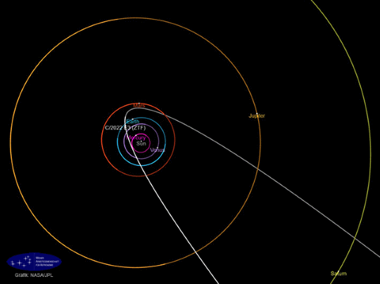 C/2022 E3 nähert sich der Sonne bis auf 1,11 astronomische Einheiten. Die Bahn ist um etwa 109 Grad gegenüber der Ekliptik geneigt. Das C bedeutet: Er ist kein periodischer Komet, seine Umlaufzeit beträgt etwa 50 000 Jahre. |