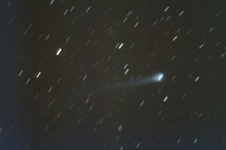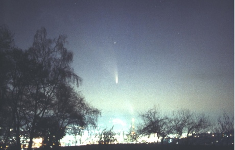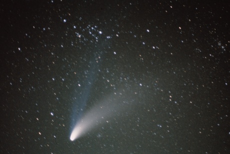 Hale-Bopp C/1995 O1Dieser Komet wurde 1995 von zwei Amateurastronomen entdeckt und näherte sich im März 1997 bis auf 100 Millionen Kilometer der Erde. Seine Umlaufzeit beträgt 3000 Jahre, sein Kerndurchmesser 20 bis 45 Kilometer. Der Ionenschweif hatte eine Länge von etwa 100 Millionen Kilometer und seine Bahnneigung beträgt 89°. |