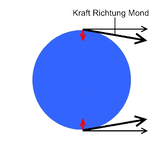 Zusätzlich muß noch die Anziehungskraft des Mondes am Nord– bzw Südpol betrachtet werden. Im Kräfteparallelogramm (die Kraft Richtung Mond wird in ihre rechtwinkligen Komponenten zerlegt) ergeben sich jeweils an den Polen Kräfte in Richtung Erdmittelpunkt. Diese Kraft in Richtung Erdmittelpunkt ist an den Polen am größten und nimmt in Richtung Äquator ab, bis sie am Äquator den Wert Null erreicht. Das leicht bewegliche Wasser wird zwischen Äquator und Pol zur Seite geschoben, ist die Menge groß genug drückt ein Teilchen auf das nächste und das Wasser wird an den Polen nach unten gedrückt. Nur im Meer ist die Wassermenge groß genug, damit darauf Gezeitenkräfte wirken, in einem See nicht.