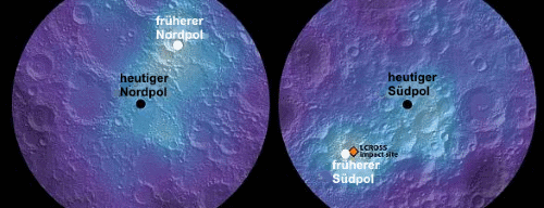 Die Gebiete und Strukturen, die auf der Mondaufnahme gekennzeichnet sind, werden im Text beschrieben. |