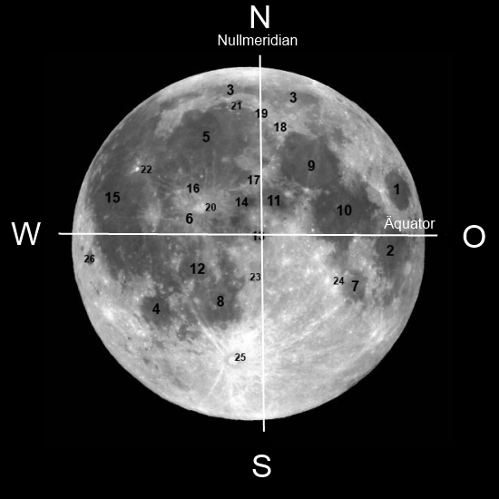 Das nahezu vollständige Fehlen einer Atmosphäre und die Erdnähe lassen auf dem Mond schon mit bloßem Auge helle (Terrae) und dunkle (Maria) Gebiete ausmachen.