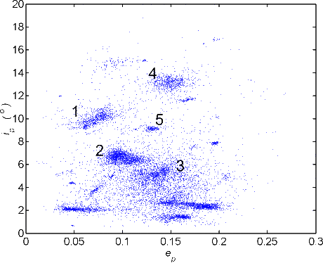 Darstellung der Bahnelemente Inklination gegen Exzentrizität für nummerierte Asteroiden.