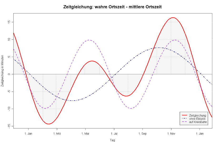 1.3 ZeitgleichungAls Zeitgleichung wird die Differenz zwischen der wahren Sonnenzeit (wahre Ortszeit WOZ) und der mittlere Sonnenzeit (mittlere Ortszeit MOZ) eines Ortes (oder Orten auf demselben Längengrad) bezeichnet. Die Zeitgleichung wird verursacht