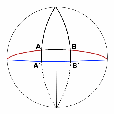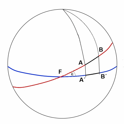 Dies bedeutet, dass hier die „wahre Sonne“ schneller läuft als die „mittlere Sonne“. Die Abbildung zeigt, dass durch die Projektion der Bewegungsabschnitt auf dem Himmelsäquator (A-B) kleiner ist als auf der Ekliptik (A´-B´).