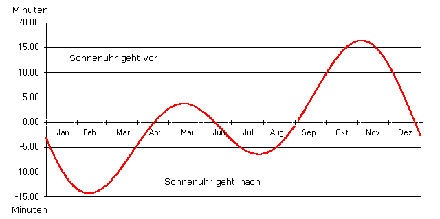 Daraus folgt, dass die „wahre Sonne“ schneller läuft als die „mittlere Sonne“. Somit ist die Änderung der Zeitgleichung positiv.