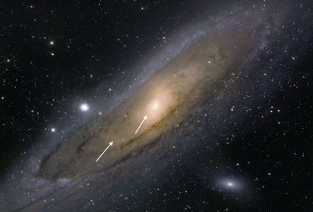 Da sich der Andromedanebel mit 300 km/sec unserer Milchstraße nähert, werden die beiden Galaxien in 4 Milliarden Jahren kollidieren. Schon in 2 Milliarden Jahren nähern sich M31 und die Milchstraße so sehr, dass die starke Anziehungskraft des Andromedanebels die Sterne aus der Milchstraßenscheibe herausreißt. Im Laufe der Jahrmillionen löst sich das dem irdischen Beobachter vertraute Band der Milchstraße auf. Die Sterne verteilen sich auf relativ ungeordnete Bahnen am Rand der Milchstraße.