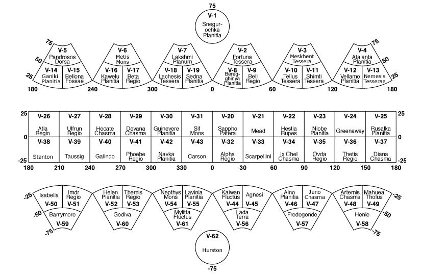 Topografische Karte der Venus, eingeblendetwerden die Kartennummern weiter unten. | ||||||||||||||||||||||||||||||||||||||||||||||||||||||||||||||||||||||||||||||||||||||||||||||||||||||||||||||||||||||||||||||||||||||||||||||||||||||||||||||||||||||||||||||||||||||||||||||||||||||||||