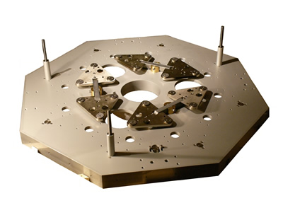 Die Auflage besteht aus einem Wippen-System, dem Wiffle Tree. Drei Auflagepunkte auf sechs Platten unterstützen den Spiegel gleichmäßig.