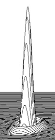 Das Bild links zeigt die dreidimensionale Darstellung eines Beugungsscheibchens. Das Licht wird an Kanten im Teleskop gebeugt und das Sternbild verschmiert, das Licht verteilt sich auf die Maximaringe des Beugungsscheibchens. Der Kontrast des Bildes ist am besten, je mehr Licht im ersten und je weniger Licht im zweiten Maximum enthalten ist. |