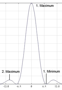 Durch die große Entfernung der Sterne erwartet man normalerweise, dass der Stern punktförmig abgebildet wird. Jedoch verhindert dies das physikalische Gesetz der Beugung des Lichts durch den Rand der Optik. Dies ist der Grund, dass Sterne als kleine Scheibchen abgebildet werden, die die Schärfe begrenzen. Es können zum Beispiel zwei Sterne nur dann getrennt werden, wenn sie mehr als den Durchmesser des Beugungsscheibchens auseinander stehen. Bei dem Cassegrain-System haben die Scheibchen einen Durchmesser von 0,2“. Dies entspricht einer Größe, von München nach Stuttgart gesehen, vom Durchmesser eines Kochtopfes (20 cm). |