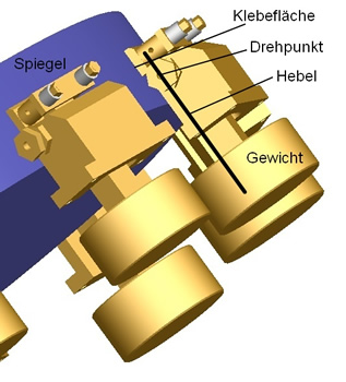 Ein Ende des Hebels vom Push-Pull Systems ragt in ein an den Spiegel aufgeklebten Sockel. Am anderen Ende befindet sich ein Gewicht von 1,4 kg. Durch den Hebel werden, je nach Lage des Spiegels, verschieden große Zug- oder Druckkräfte auf den Spiegel ausgeübt.
