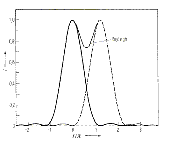 Nach dem Rayleigh-Kriterium (Bild rechts) werden Doppelsterne getrennt gesehen, wenn sich die Beugungsscheibchen eines Sterns gerade so überlagern, dass das Minimum des ersten mit dem Maximum des zweiten zusammenfällt. |